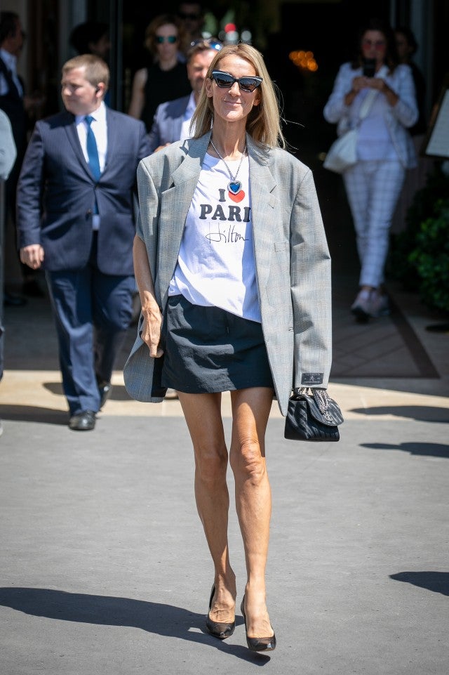Dion -- who also debuted a slick lob -- paired the standout accessory with an oversized gray Vetements blazer, tee and skirt from the designer's spring 2020 collection. She also carried a black Balenciaga chain-strap purse and wore dark pointed-toe heels and sunglasses.