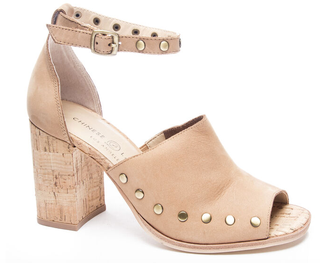 These Natural Colored Chinese Laundry cork-textured heel sandals feature a peep-toe and shiny studs.