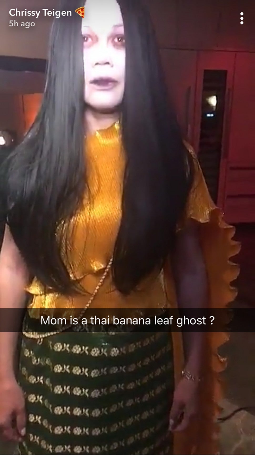 Not in on the family costume was Teigen’s hilarious mom, Vilailuck Teigen, who dressed as (according to Chrissy) a “Thai banana leaf ghost.”