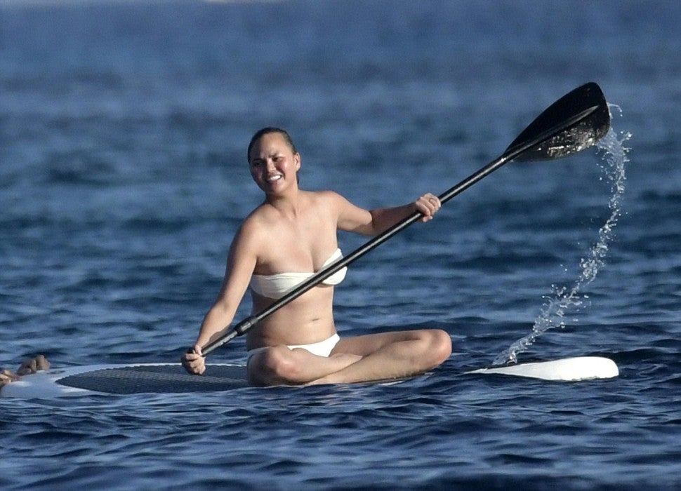 Teigen appeared to be having a blast on vacation, sitting pretzel style while paddleboarding in the crystal clear waters. The 31-year-old model was photographed makeup-free, sporting a white strapless bikini top and matching bottoms.
