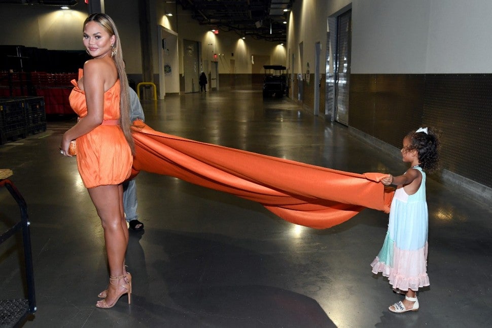 Teigen was joined by her husband, John Legend, and their 5-year-old daughter, Luna, who peeked out of her mom's orange dress train on the red carpet.