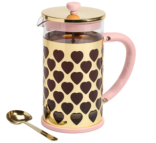 Pour the perfect cup of coffee with this lovely heart-themed French press and coffee spoon set.