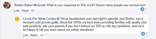 Following the episode, fans were devastated over the fact that a simple Crock-Pot could have been the cause of Jack's death, some even decrying the use of their own slow cookers. On Wednesday, the Crock-Pot company responded on social media -- even creating a new hashtag on Twitter, #CrockPotIsInnocent -- to fans yearning for answers.