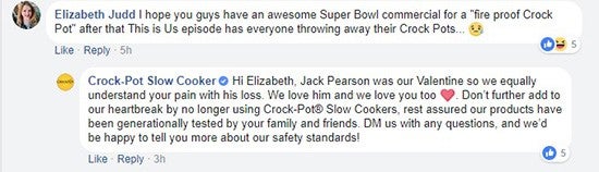 "Jack Pearson was our Valentine so we equally understand your pain with his loss. We love him and we love you too ❤," the company wrote on its Facebook page in response to a fan seeking a statement over people throwing away their slow cookers. "Don’t further add to our heartbreak by no longer using Crock-Pot Slow Cookers, rest assured our products have been generationally tested by your family and friends."