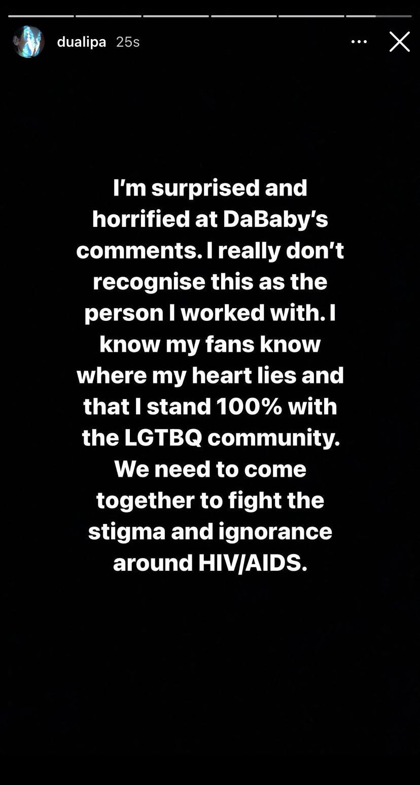 "I'm surprised and horrified at DaBaby's comments," Lipa wrote in a post she shared to her Instagram story. "I really don't recognize this as the person I worked with."