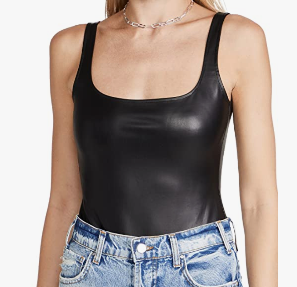 You'll feel sleek and sexy in a faux leather bodysuit, especially with its open back.