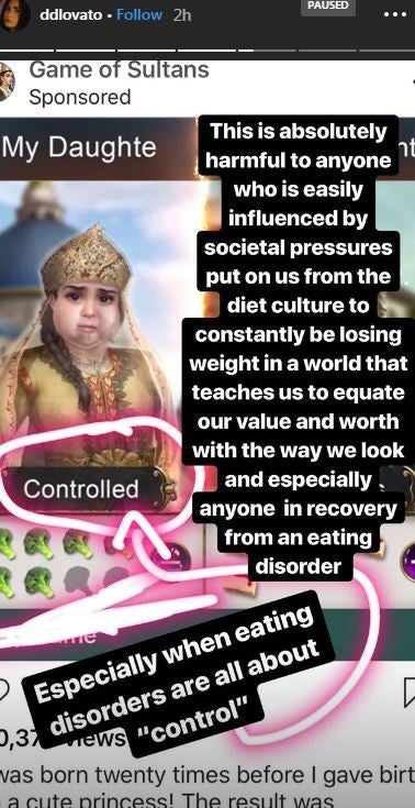 The "Sorry Not Sorry" songstress concluded her message by writing, "So please Instagram, keep this bulls**t off mine and other's feeds who could be easily effected by this disgusting advertisement. With how aware people are becoming of mental health and mental illnesses, I expect you guys to know better by allowing this advertisement on your app. And shame on the game."