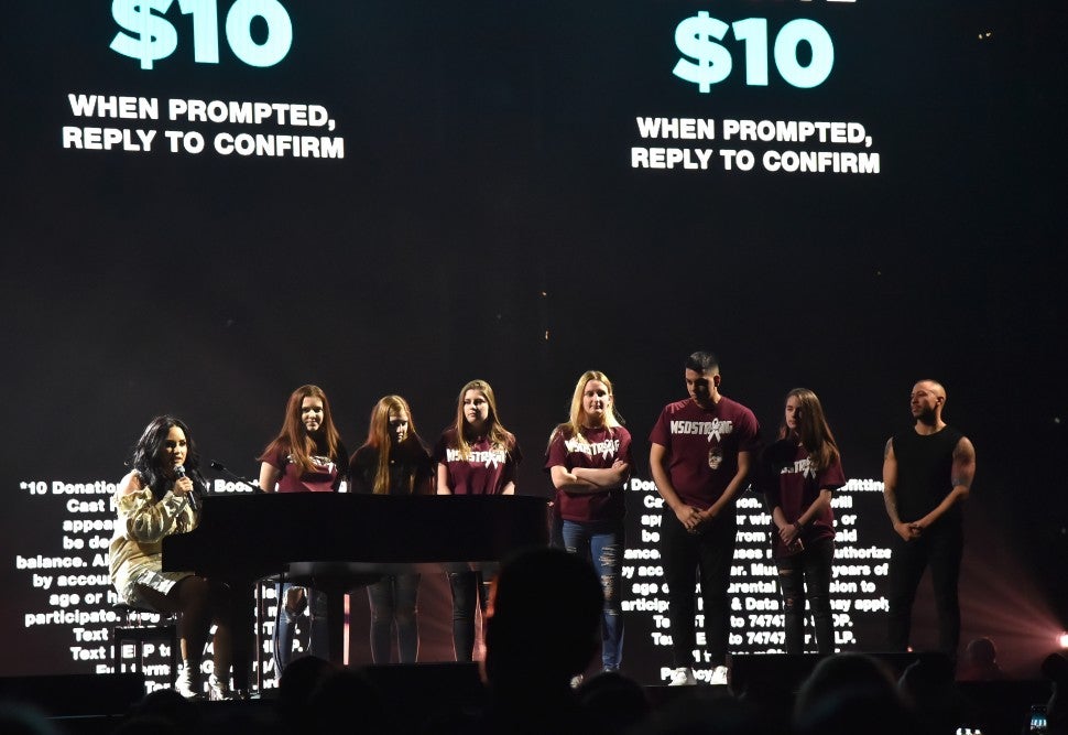 Julius Castillo, Mackenzie Marie Chapman, Samantha Megan Deitsch, Maia Hebron, Eden Hebron and Sarah Stricker -- all students at Marjory Stoneman Douglas High School, where 17 teens and teachers were killed by a former student on Feb. 14 -- met with Lovato and opener DJ Khaled before the show and joined her on stage to help raise funds for the CAST Foundation, which will go toward mental health resources for the students.
