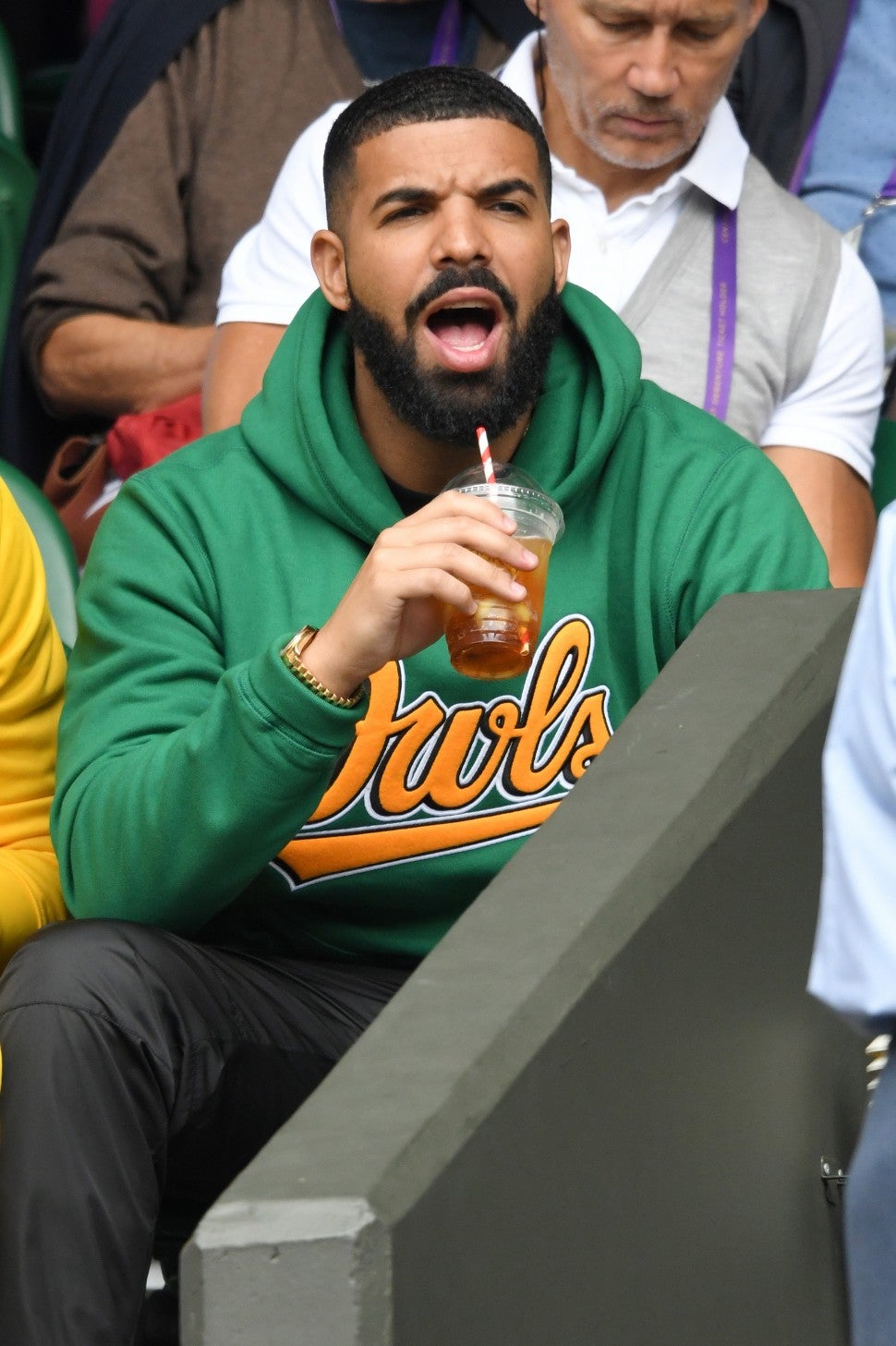 The 31-year-old rapper cheered on Williams during her quarterfinal match at Wimbledon against Camila Giorgi on Tuesday, where he was clearly completely invested in the game judging by his passionate reactions from the stands. The camera caught Drake in what appeared to be wildly different moods as the match progressed -- from mad, happy, concerned and even pensive.