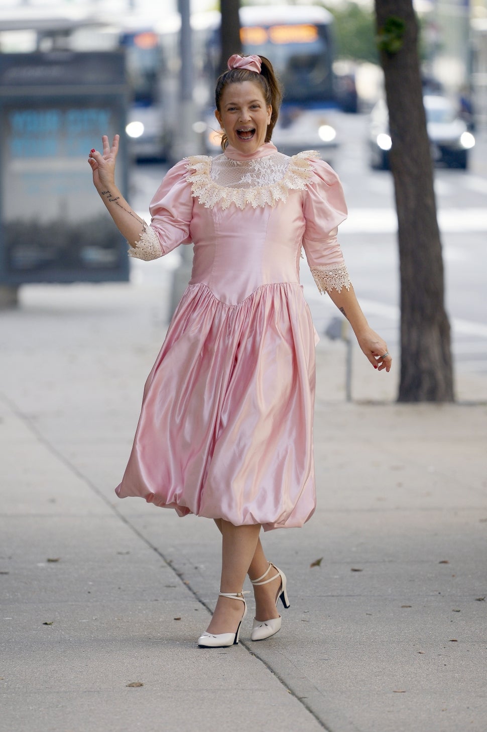 Dressed in an '80s-style pink dress, a matching hair tie in her ponytail and white heels, the 46-year-old actress happily waved to cameras while in costume. In Never Been Kissed, Josie Geller (Barrymore) was called Josie Grossie when she was in high school, but as an adult and a journalist for the Chicago Sun-Times, she gets to do it all again. For a piece for the newspaper, Josie poses as a student at her former high school to research contemporary teenage culture. Everything is going OK until she falls for her dreamy English teacher, Sam Coulson (Michael Vartan).