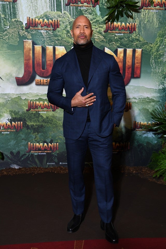 Dwayne Johnson and Nick Jonas engaged in a battle of the slickest suits at all the Jumanji: Welcome to the Jungle premieres.