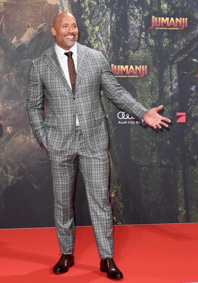 The former wrestler went for a more subdued look, yet still fashion forward. Johnson was again dressed in a custom-made blue plaid Isaia suit, which he paired with a blueish-gray button-up, a floral tie and brown leather Louboutin shoes.