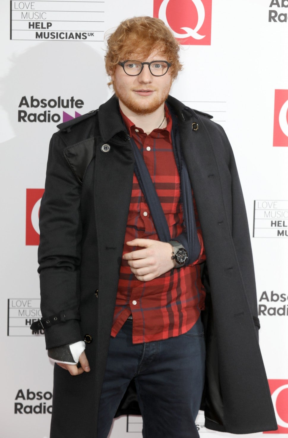 The "Shape of You" singer walked the carpet at the 2017 Q Awards in London on Wednesday, with his right arm in a cast and his left in a sling, after a scary bicycle accident on Monday forced him to cancel several shows.