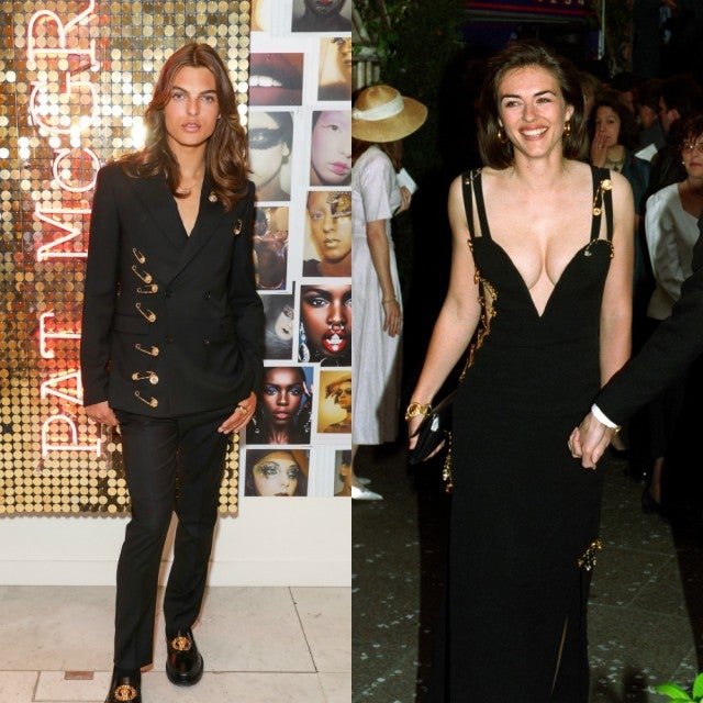 The sleek ensemble was reminiscent of the jaw-dropping deep-V safety pin Versace number that the stunning actress wore when she accompanied Hugh Grant to the 1994 premiere of Four Weddings and a Funeral.