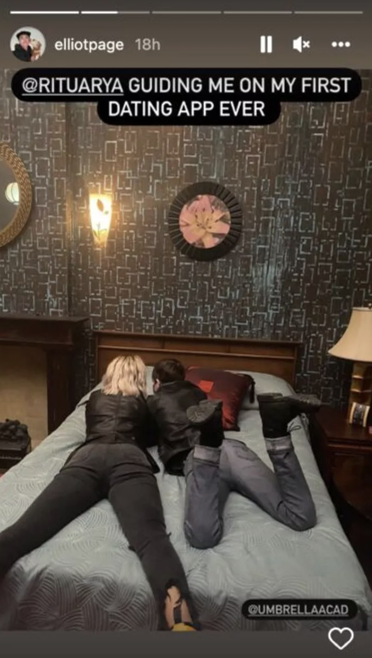Elliot Page is getting back out there, and he's getting a little help from The Umbrella Academy's Ritu Arya. The 35-year-old actor took to his Instagram Story and shared a photo of himself on a bed next to Arya looking at what's presumably Page's cell phone. He captioned the Story, saying, "@rituarya guiding me on my first dating app ever.”