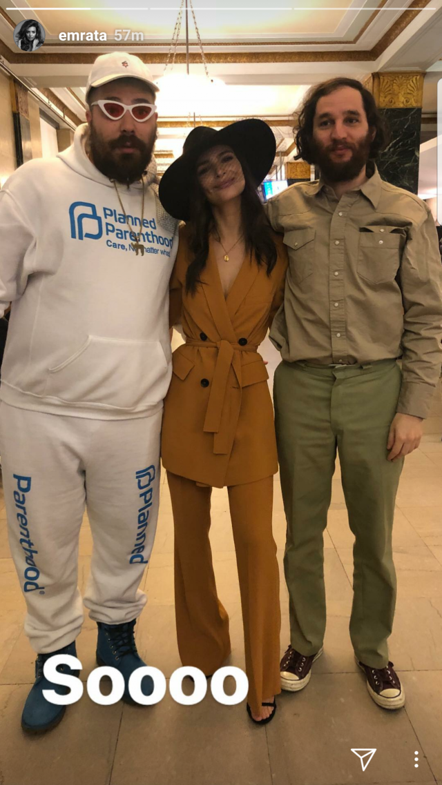 "Sooo I have a surprise," she captioned photos on her Instagram Story, posing alongside friends (including The Fat Jewish), a pug and finally her betrothed. "I got married today." The Gone Girl actress could not have looked more chic for her special day, donning a black veiled hat and a mustard suit. Ratajkowski accessorized her look with strappy black sandals, a simple gold necklace and her new wedding band.