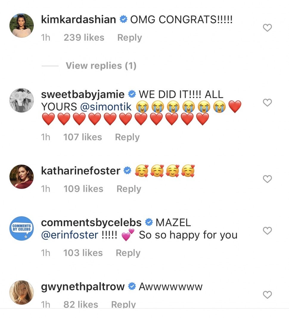 Kim Kardashian West commented on the post, writing, "OMG CONGRATS!!!!!" while Sara and Erin's stepmom, Katharine McPhee, put three faces with hearts emojis, and Gwyneth Paltrow wrote, "Awwwwww."