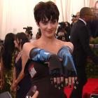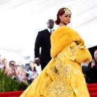 Rihanna Shuts Down 2015 Met Gala Red Carpet With Epic Yellow Cape The singer's Guo Pei ensemble required three handlers to carry the train up the stairs.