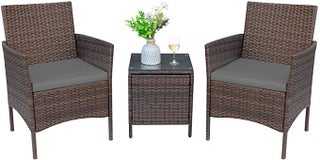 Hurry to score this affordable three-piece patio furniture set, including two wicker chairs and a small table.