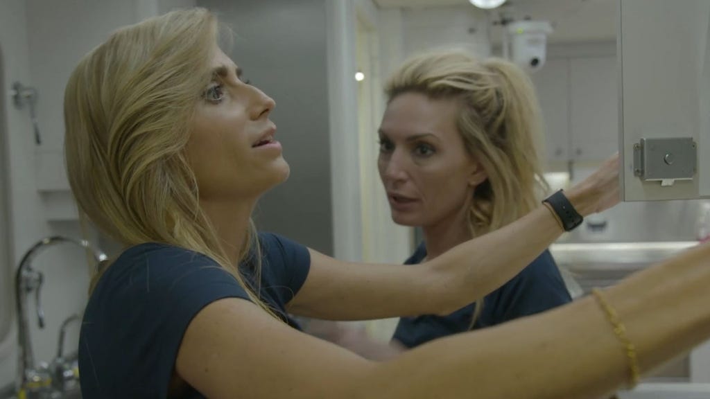 First, Kate has to call for Jen over the walkies a few times before she appears in the galley, and when she does show up, she complains about having to make the charter guests some drinks.