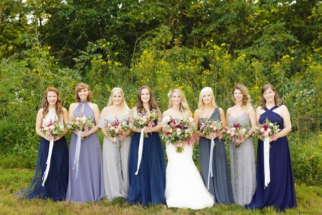 The bride stunned in a lace, form-fitting gown by Maggie Sottero, flanked by bridesmaids in perfectly mismatched blue and grey gowns -- each by a different designer. Tiffany carried an ethereal bouquet of florals plucked straight from the venue as she walked down the aisle to Coldplay's "Til Kingdom Come."