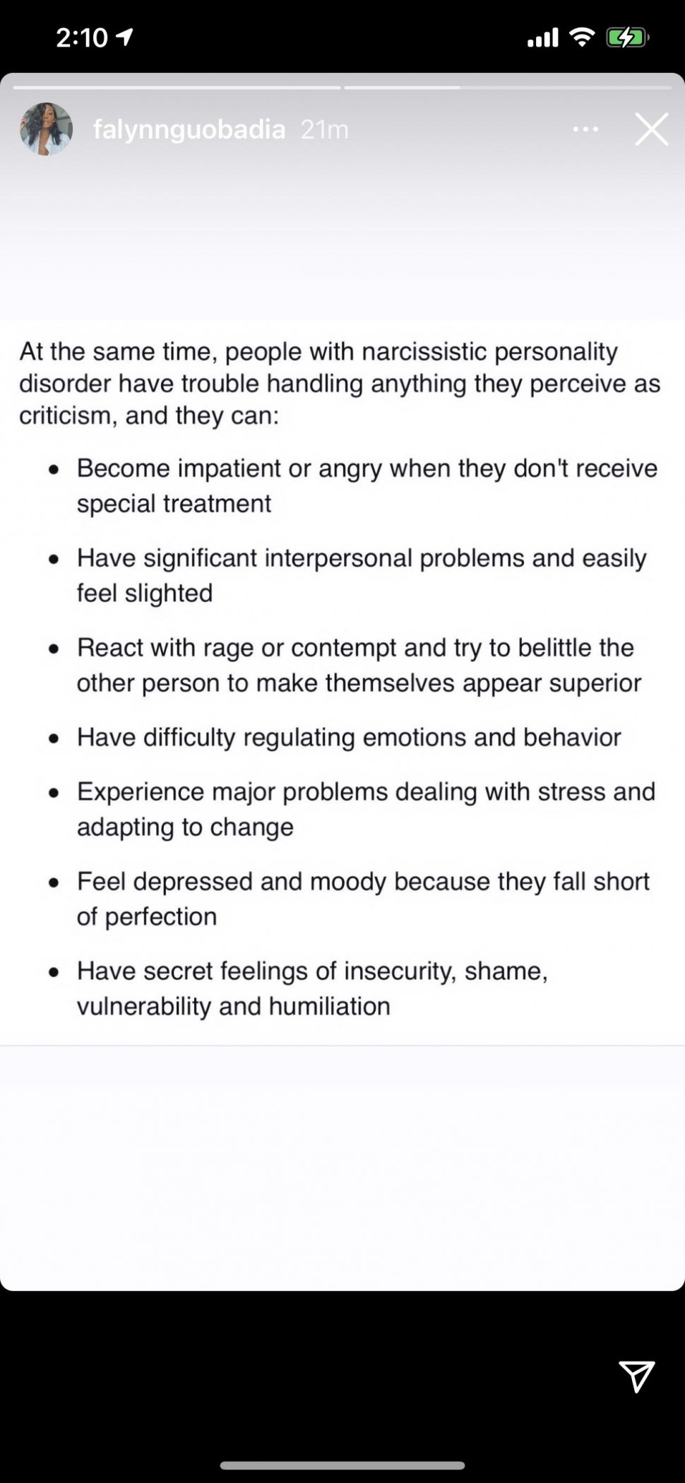Falynn then seemingly hit back with a post on her Instagram Stories about people with narcissistic personality disorder.