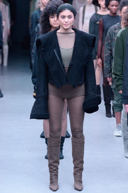 Though the 19-year-old model is pretty much a fixture on runways these days, it's actually her younger sister Kylie, 17, who stole the spotlight at Kanye West's star-studded Adidas show at New York Fashion Week on Thursday. Kylie walked the runway in a brown spandex look, a black coat and knee-high boots, most strikingly covering her long hair in a skin-tight cap.