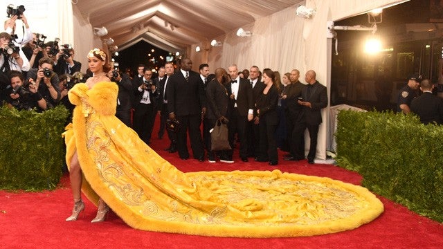 The "Bitch Better Have My Money" singer embraced the theme of the event, "China: Through the Looking Glass," donning the couture cape by Chinese designer Guo Pei over a pink dress. The bright yellow color and sheer size of the singer’s cape immediately inspired fans on the internet.
