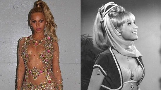 While the dress showed off nearly every part of her body, Beyonce topped the risqué look off with a retro top-knot pony tail that made her look like Barbara Eden from I Dream of Jeannie.