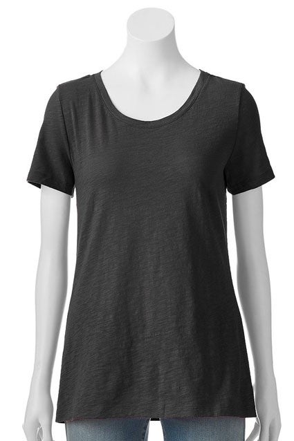 We found similar items at Kohl's, like this slubbed crewneck tee, lock toggle necklace, skinny jeans, and walking shoes. Click here for the whole look.