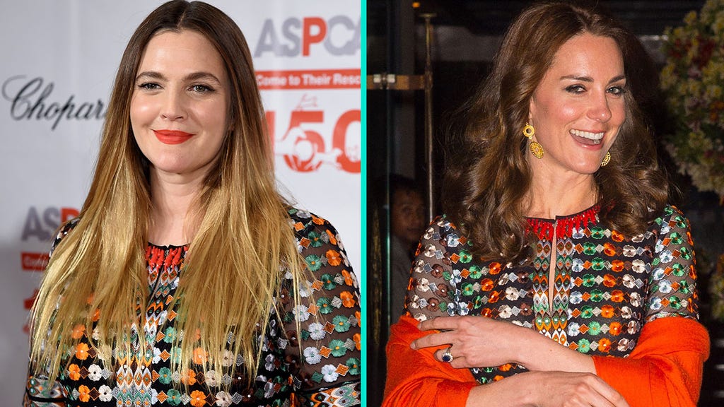 However, the impressive show of linear thinking didn't extend to their shoes or accessories. While Barrymore paired the long gown with grey heels, Middleton opted for a pair of strappy black heels, and topped off the ensemble with a vibrant orange shawl
