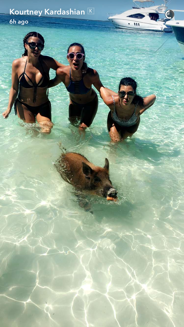 Kourtney rocked a figure-hugging printed one-piece for the fun day out, where she got in touch with the local wildlife, from stingrays to pigs...