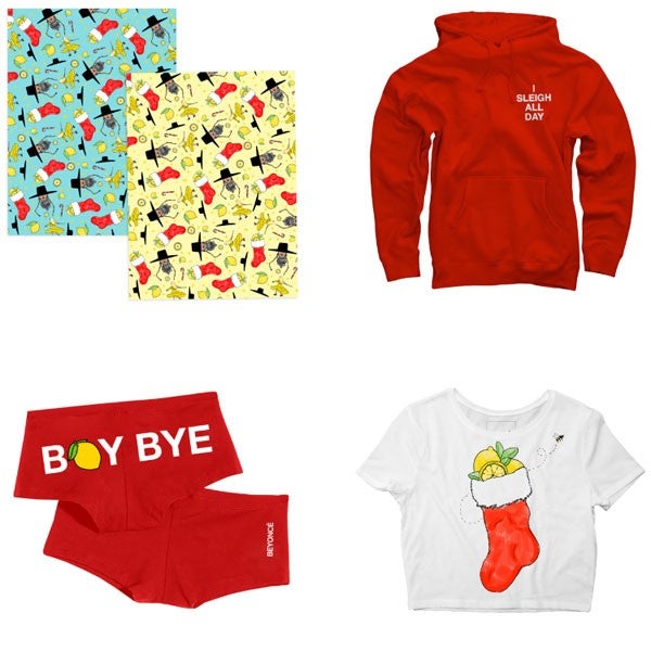 Just weeks away from Christmas, Beyonce debuted a holiday-themed line of merchandise on her website that goes along with her beloved Lemonade album that was released earlier this year. The items include $16 wrapping paper adorned with lemons and icons of Beyonce from her "Formation" and "Hold Up" music videos, as well as $60 red and green sweatsuits with the lyric, "I sleigh all day," with slay spelled differently as a festive message. The collection also features red underwear with "Boy bye," one of the standout lines from her track, "Sorry," over the derriere.