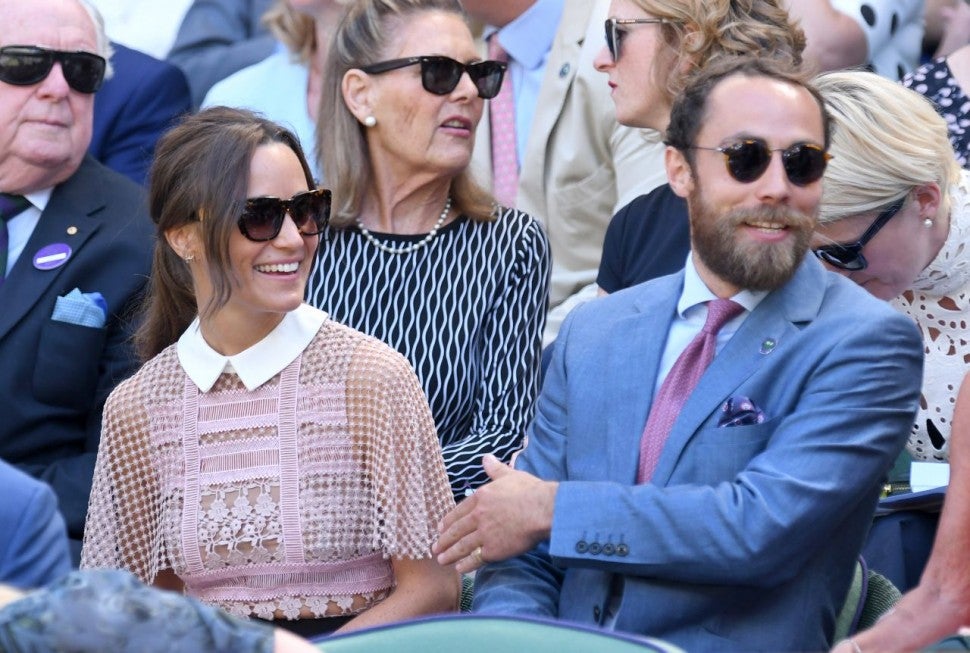 She kept the rest of her look simple, sporting a pair of gray stilettos, tortoise shell sunglasses and statement earrings as she arrived to the prestigious tennis tournament with her brother, James Middleton. The businessman seemingly complemented his sister's ensemble, accessorizing his baby blue suit with a pink tie and suede boots.