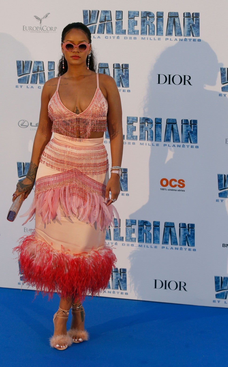 The "Work" singer wore a pale pink, feathered and beaded two-piece look at the film's premiere in La Plaine-Saint-Denis, Paris. RiRi accessorized her look with Chopard Jewelry -- which included pearl and diamond drop earrings, a watch, a diamond bracelet and rings -- as well as a sparkly clutch, pink shades and strappy heels with fur trimming.