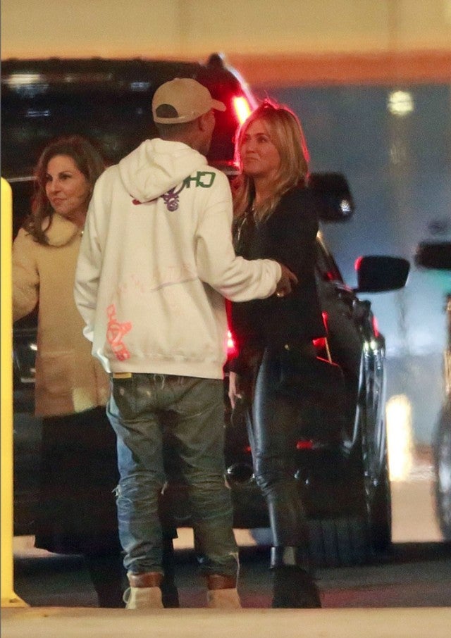 Jennifer Aniston also seemed to be in good spirits on Saturday, laughing and smiling as she ran into her pal, Pharrell Williams.