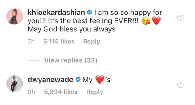 Khloe Kardashian, who gave birth to her first child earlier this year, echoed those sentiments, writing, "I am so so happy for you!!! It's the best feeling EVER!!! May God bless you always."