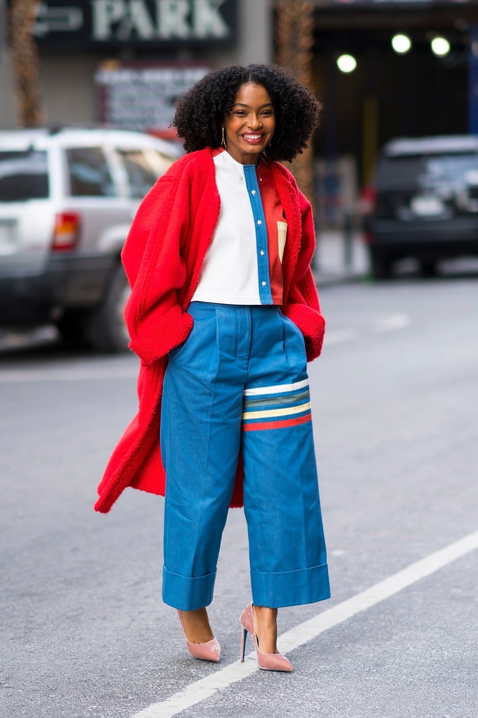 Shahidi donned a playful matching Thom Brown top with blue pants that featured four colored stripes, an oversized Opening Ceremony red coat and pale pink Loriblu heels.