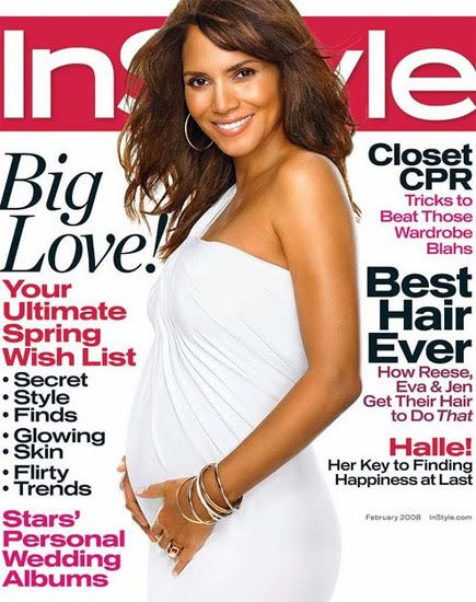Halle Berry kept her clothes on but put her pregnant stomach on display for the cover of the February 2008 InStyle. She was expecting daughter Nahla with then-boyfriend Gabriel Aubrey.