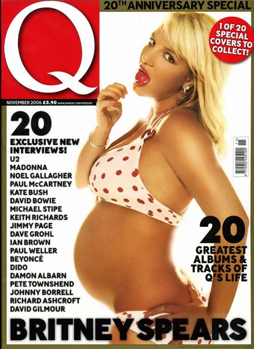 Britney Spears showed her pregnant stomach once more on the November 2006 issue of Q Magazine. This cover was part of the magazine’s 20th Anniversary special issues.