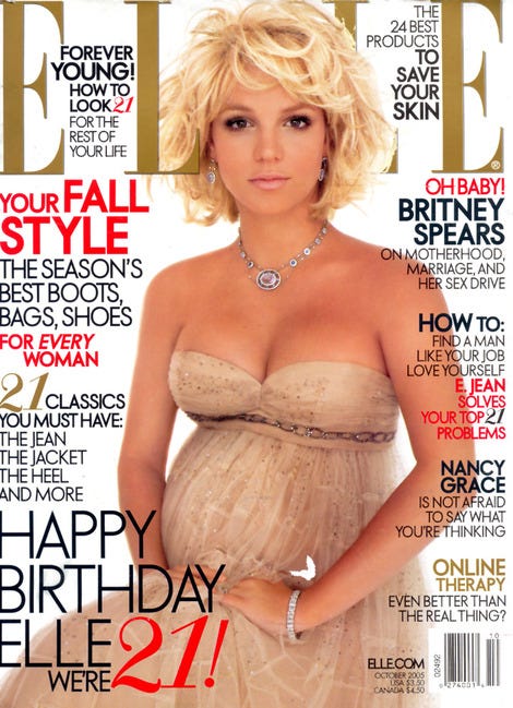 Sporting a much shorter hair-do, Britney Spears poses on the cover of Elle magazine’s October 2005 issue. Spears was pregnant with her first child with then- husband Kevin Federline.