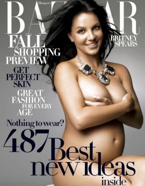 Next for Britney Spears was the August 2006 cover of Harper’s Bazaar. She was pregnant with her second son, Jayden James, and holds her oldest son Sean Preston in the interior photos.
