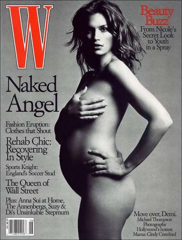 In 1999, Cindy Crawford showed her very pregnant belly in a gorgeous black and white cover for W magazine. This was Crawford and husband Rande Gerber’s first child.