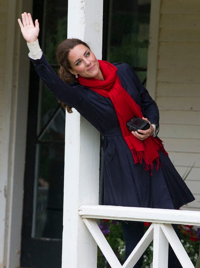 The Duchess of Cambridge bundles up in a knee length navy coat, topped off with a lively red scarf. Catherine gives a wave to her husband as he takes part in helicopter maneuvers called "water birding" on July 4, 2011 in Charlottetown, Canada.
