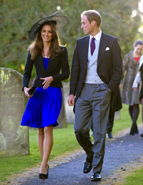 Kate is pretty as a princess in a vivid blue frock, as her prince walks alongside wearing a tux with an eggplant tie as they attend the wedding of close friends Harry Meade and Rosie Bradford on October 23, 2010 in Northleach near Cheltenham, England.