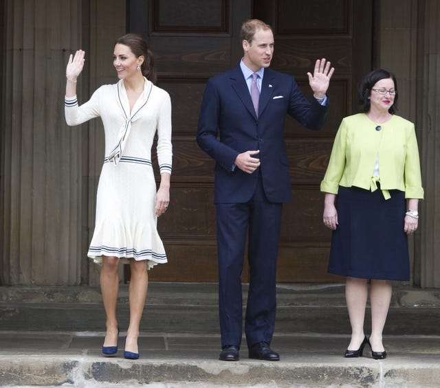 Catherine wore a cobalt-blue Erdem design with a lacy, floral applique neckline. She paired the bright dress with nude patent platform shoes and a matching clutch. This is the second dress from Canadian-born designer Erdem Moralioglu she wore on her Canadian visit.