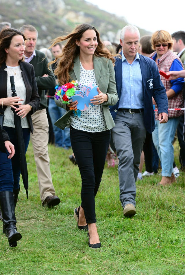 New mom Kate Middleton was rocking a contemporary-casual style at the Ring O'Fire Anglesey Coastal Ultra Marathon on Aug. 30, 2013 in Holyhead, Wales. Sporting a printed blouse, black skinny jeans, a gray blazer and black wedges, the Duchess of Cambridge continues to be a style icon even after giving birth to baby George. Click the pics for more of her envy-worthy looks.