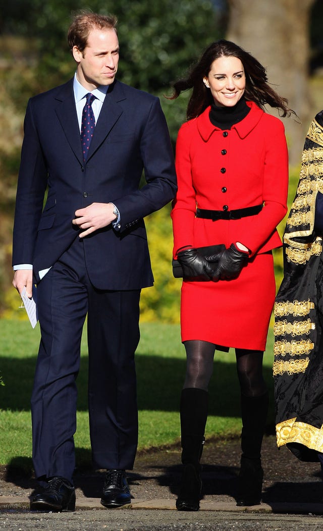 Kate donned a red skirt suit by Italian designer Luisa Spagnoli and boots by Aquatalia by Marvin K in this visit to the University of St Andrews on February 25, 2011 in St Andrews, Scotland.