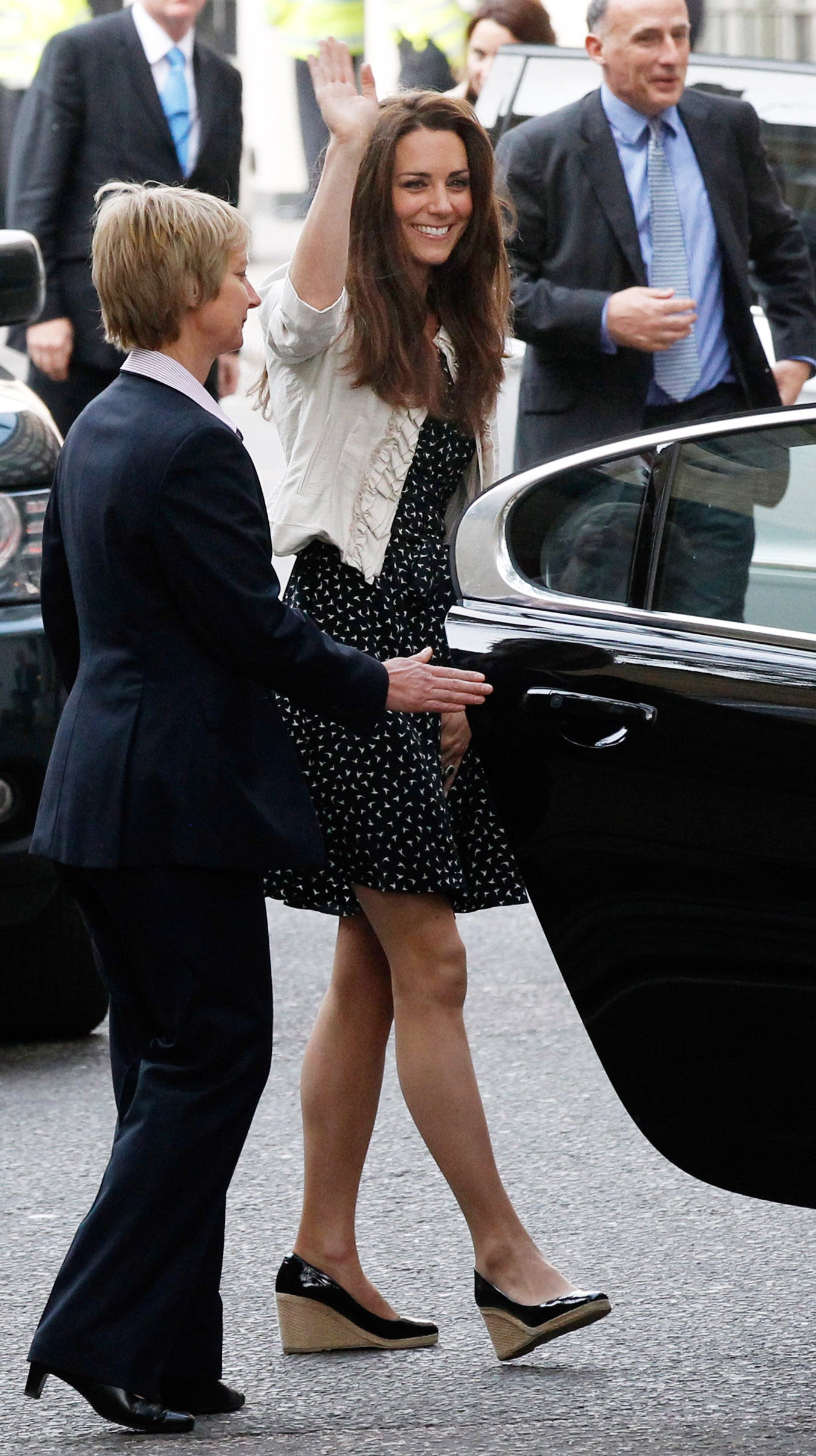Kate arrived at the hotel to cheers from a large crowd that had gathered to catch a glimpse of the bride-to-be. Before entering the hotel, Kate chatted with hotel officials and then waved to the crowd of admirers.