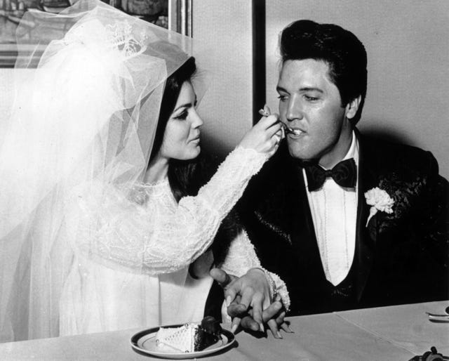 After an eight-year courtship, the king of Rock n' Roll and Priscilla Beaulieu tied the knot on May 1, 1967 at the Aladdin Hotel in Las Vegas. Priscilla reportedly designed her silk-chiffon gown for the ceremony while Elvis donned Western boots along with a standard tux.